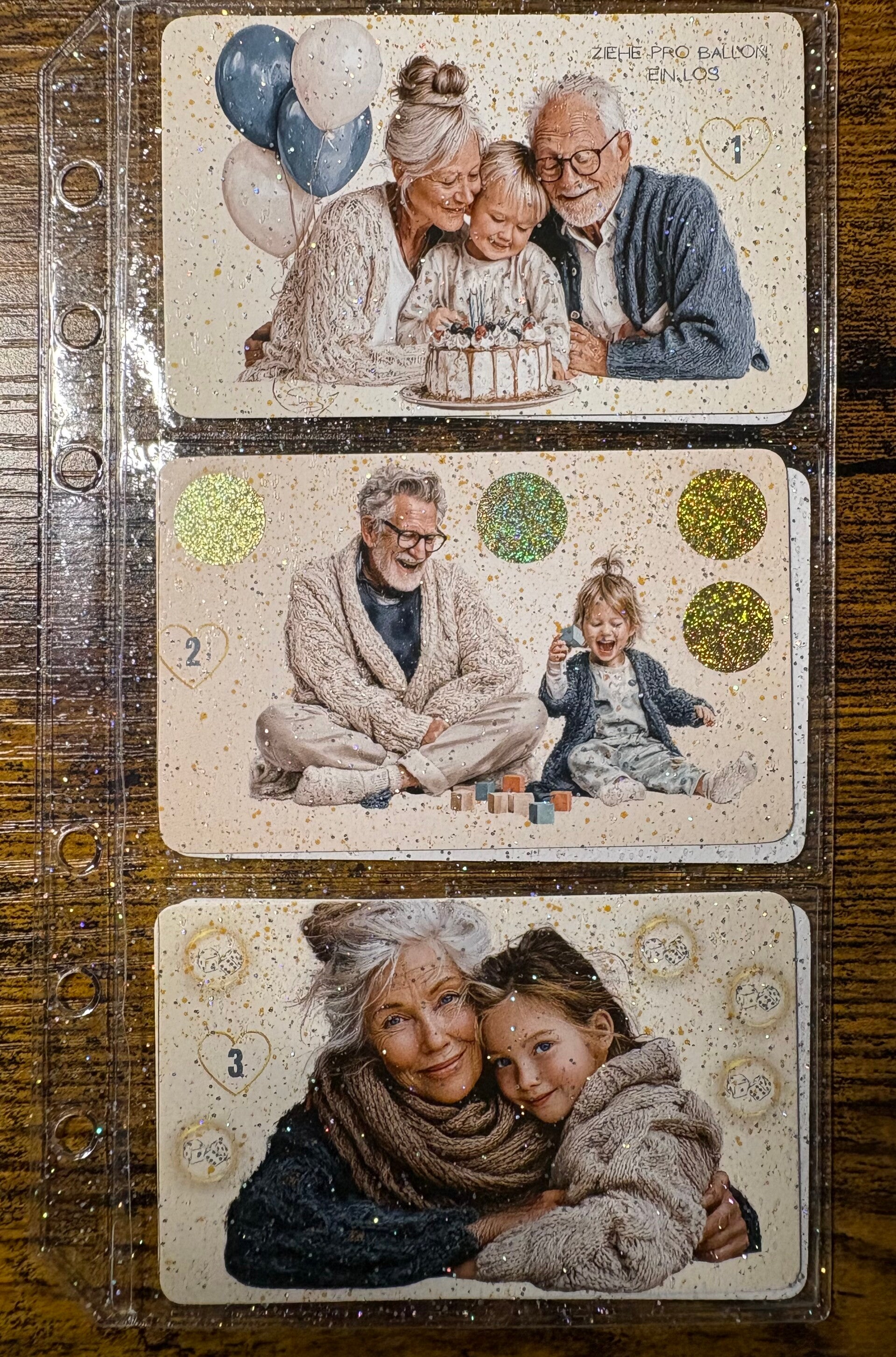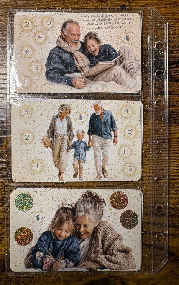 Auf dem A6 Deckblatt würfelst du auf der Rückseite immer ein Feld frei um zu schauen welche Karte du besparen darfst.